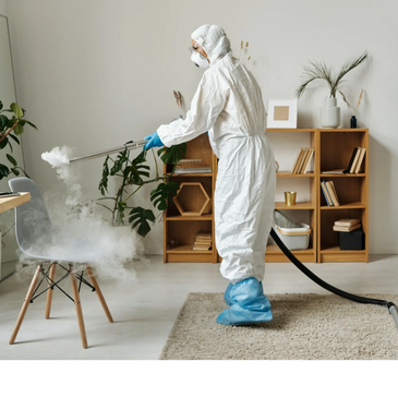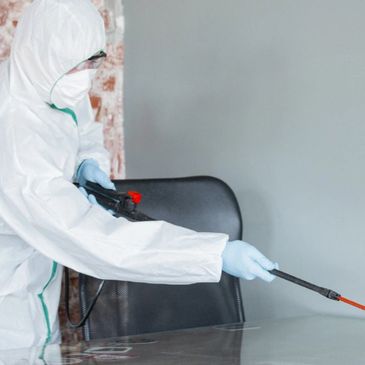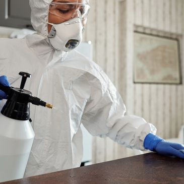 Our cleaning technicians are required to wear proper PPE. This includes full Tyvek suits, safety goggles, respirators, two layers of gloves, and foot coverings.